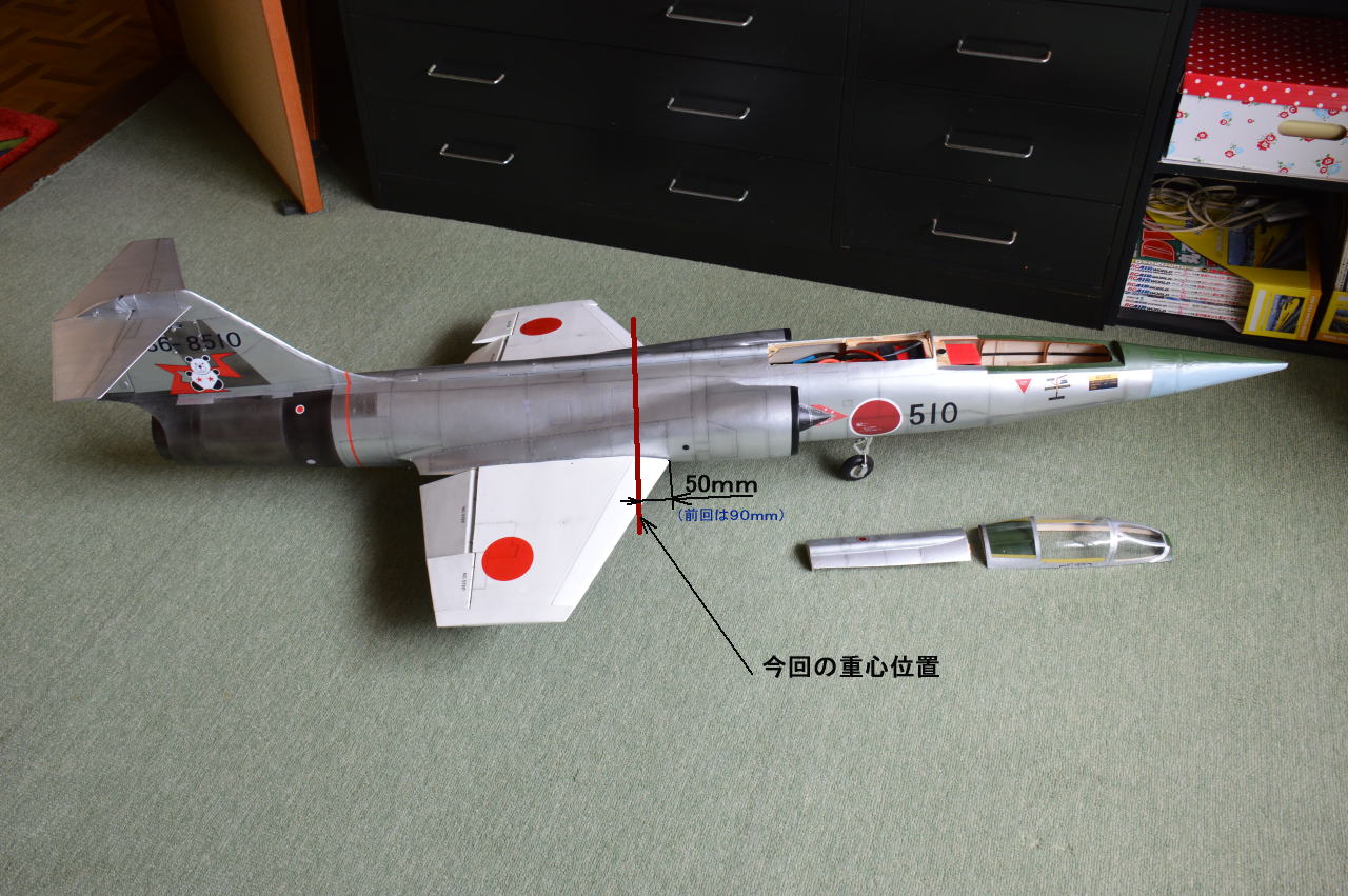 途中から2/3スロットルで飛行しましたがこの時が一番安定してました、Lipo(565g)は110mm前方へ移動、まだ後ろ重心でしょうか?。