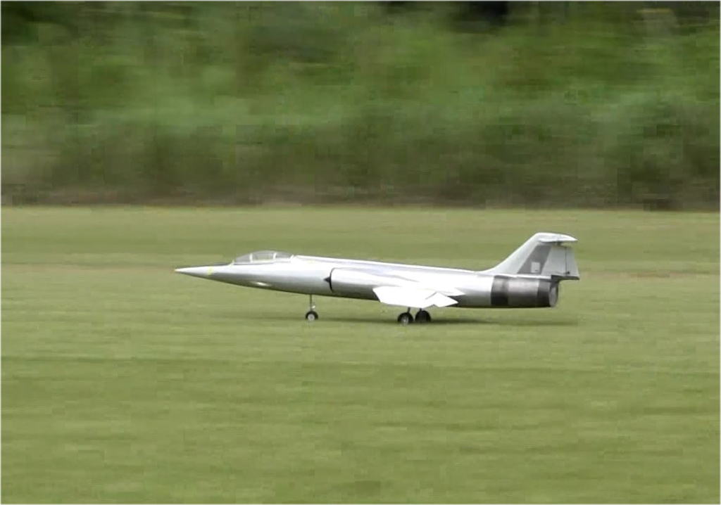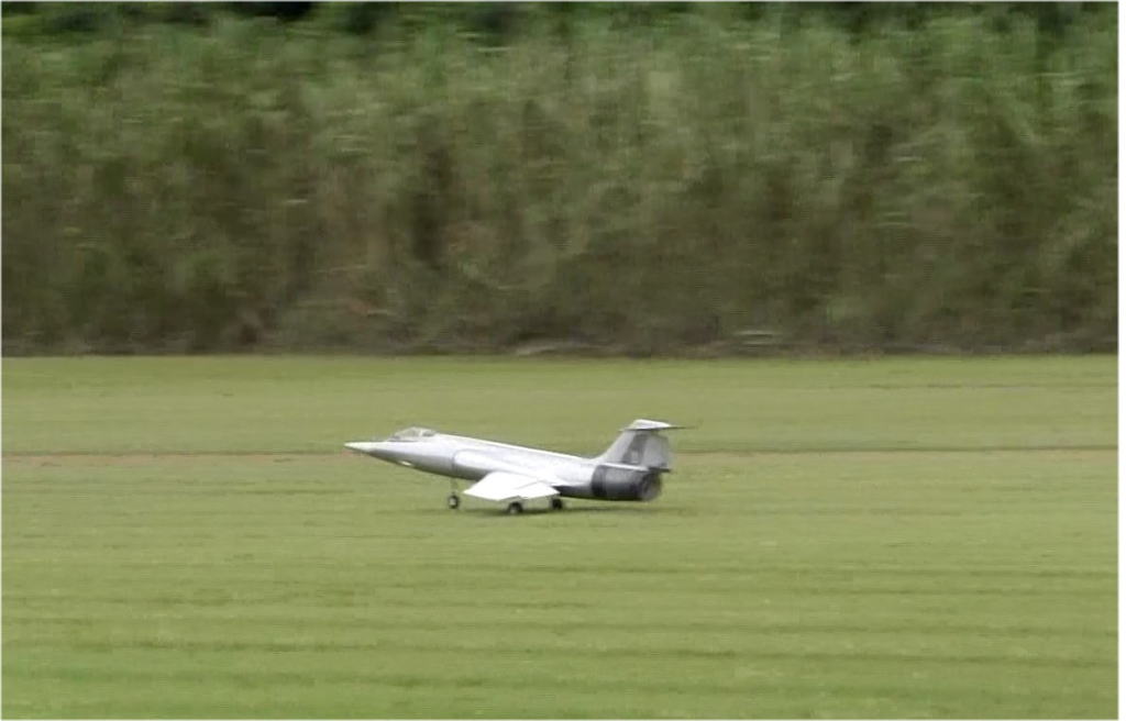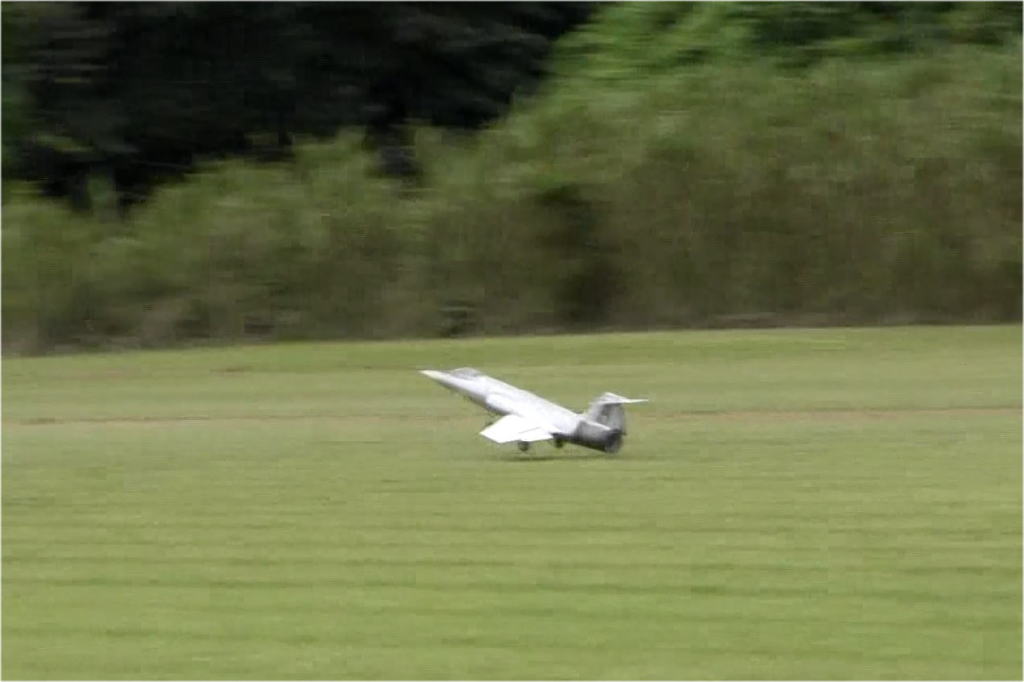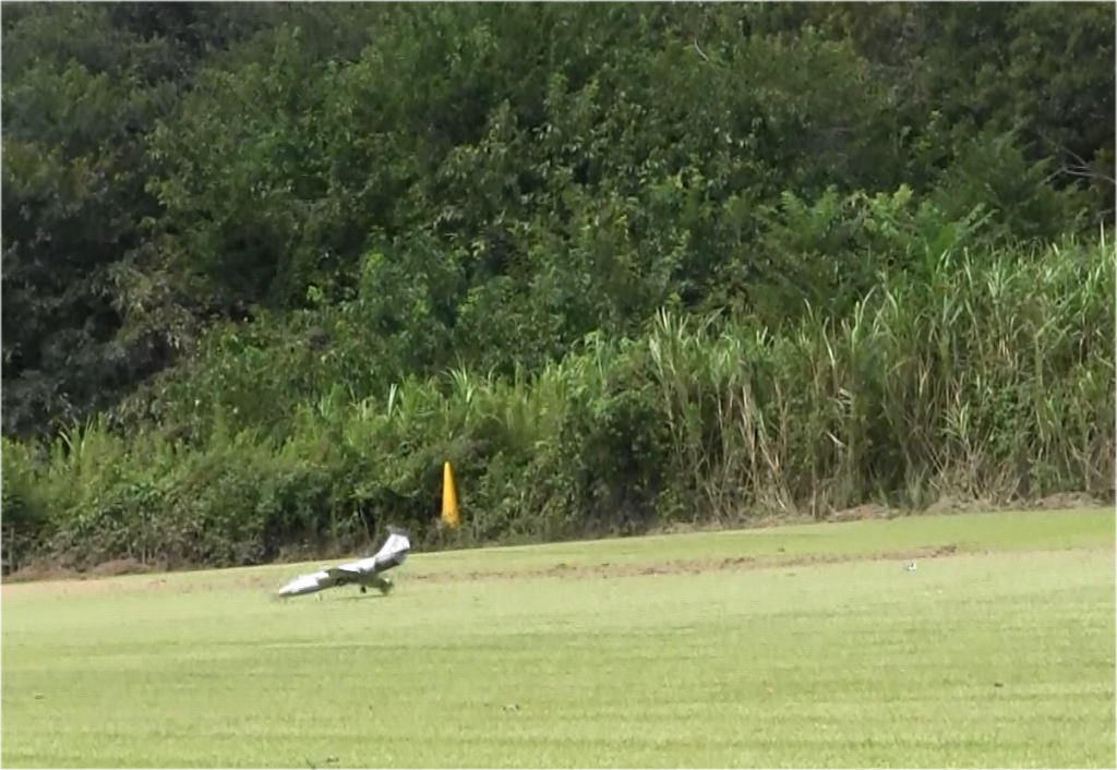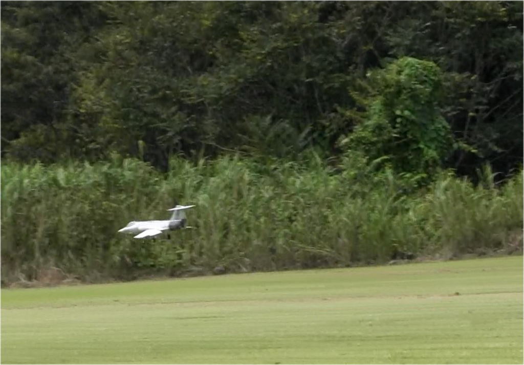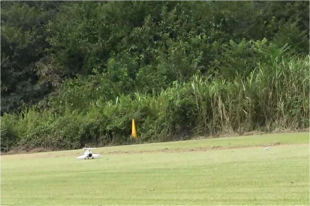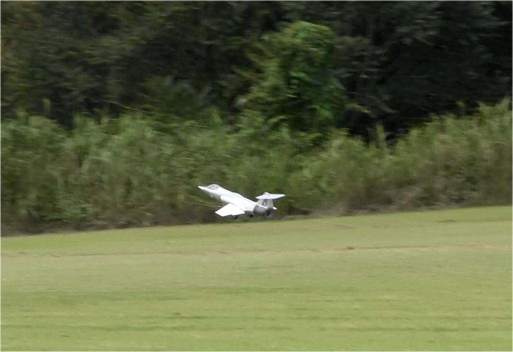 という事で1stで取り敢えずフルハイ、加速はF-4より少し悪い程度、調子よく走るので(ここで欲が出ます)60m位のところでエレベータアップ、2秒ほどで機体がえらく簡単に50cm程度浮き上がり、その後スロットルオフで、ランディングも上手くすんなりと行き、取り敢えず大成功、無風でも立派に離陸してまった